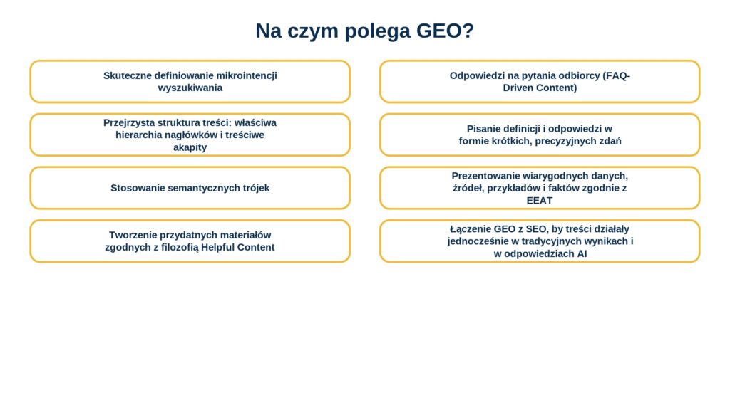 W praktyce GEO opiera się na zestawie działań, które łączą wymogi techniczne, merytoryczne i semantyczne. Właśnie dzięki nim strona zyskuje większe szanse na obecność w AI Overviews czy podsumowaniach ChatGPT. Najważniejsze elementy tego podejścia to:
