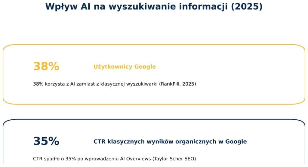 Skalę zjawiska dobrze pokazują liczby. Według analiz RankPill z 2025 roku już 38% użytkowników Internetu regularnie korzysta z narzędzi AI do wyszukiwania informacji, zamiast klasycznej wyszukiwarki. Z kolei raport Taylor Scher SEO wskazuje, że pojawienie się AI Overviews w Google obniża klikalność wyników organicznych nawet o 35%.