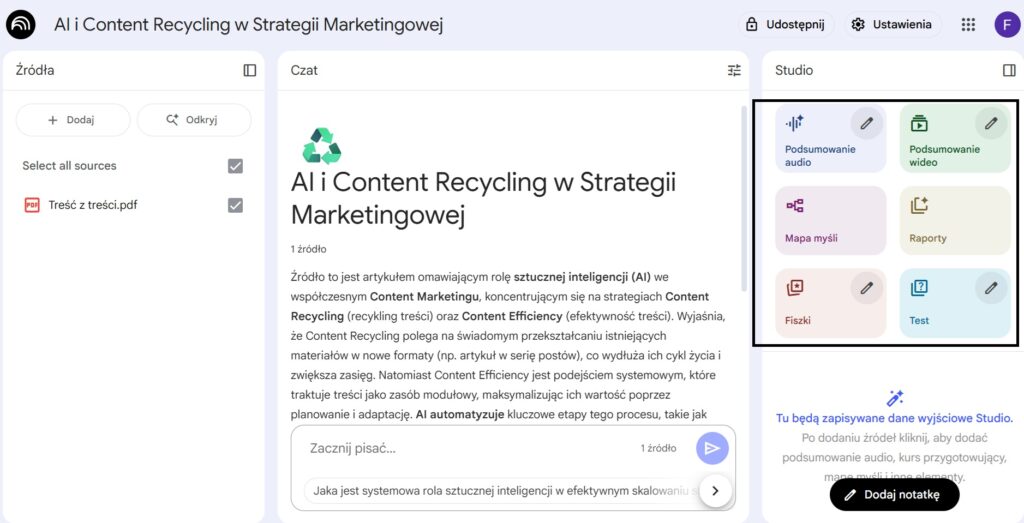 Wykorzystanie NotebookLM to prosty sposób na zwiększenie skuteczności pracy z treściami bez rozbudowanego zaplecza technicznego. Narzędzie pozwala zamieniać jeden materiał źródłowy w wiele formatów, co pozwala znacząco zwiększyć zasięgi na wszystkich etapach lejka contentowego.